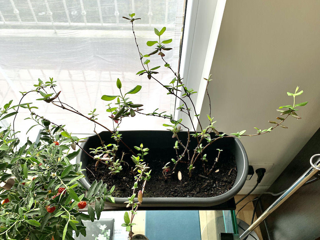 ところが、去年は強風が吹き荒れる日が結構あったんでその都度風よけできる場所に移動したりしてたんですが、ある時あまりに強風に煽られて一番長かった枝がちょっと折れてしまったんですね。仕方ないんでセロテープで補強して様子を見ることにしたんですが、年末にまたしても強風が吹き荒れて、冬だけに寒いんでこれはもう家の中に避難させてあげたほうが良いのではとプランターを室内へ入れてみたところ、これがまああれよあれよという間に新芽が出る出る。写真で見ていただくと分かると思うんですがきれいなグリーン色の葉がにょきにょきと出ております。じゃあそれまではどうだったのって言うと、若葉の下にある赤みがかった黒っぽいグリーンというか茶色っぽいのがそれまでの葉っぱざんす。しかもこれまでず〜っとこの状態だったってのがちょっとどうなのっていうね(反省)。