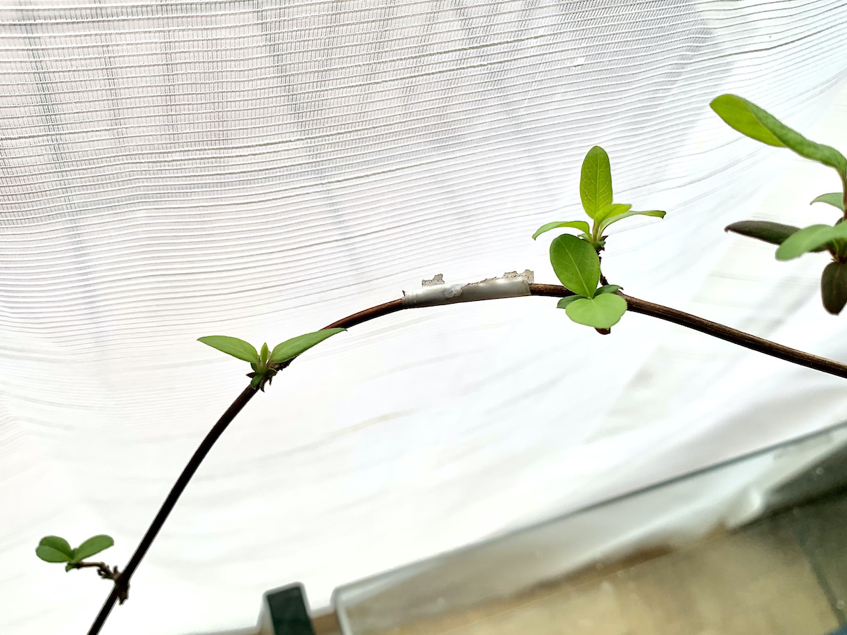なんたる生命力。もうセロテープ剥がしても良いのかもしれないんだけど、剥がす時にポキっとかなっちゃうのが怖くて剥がせないワタクシざんす。これまで外に出してたときはうんともすんともだったのにスゴいったらないの。やっぱり外で育てちゃいけなかったのかしら。でもスイカズラって外に生えてるもんじゃないんですかね・・・。しかしここまで生育に差が出るんならもっと青々するまで室内に置いてあげようと思っております。