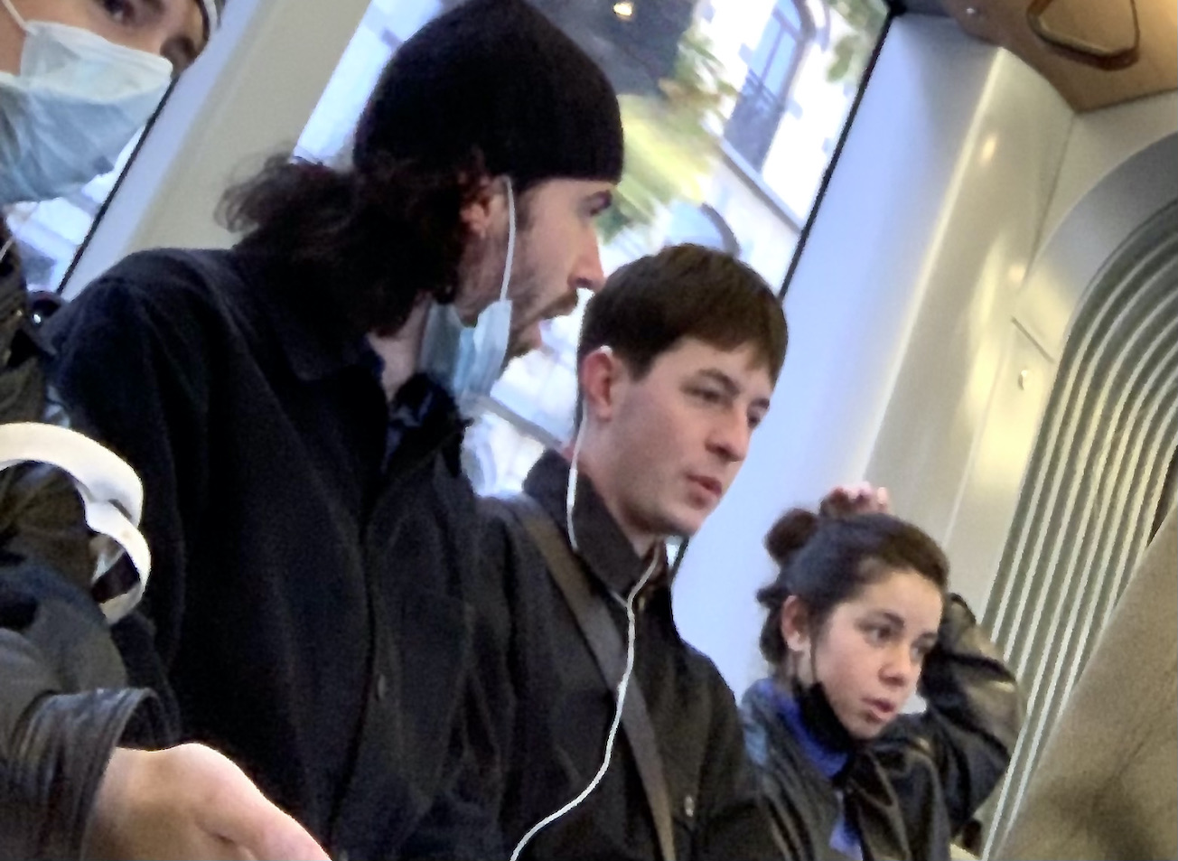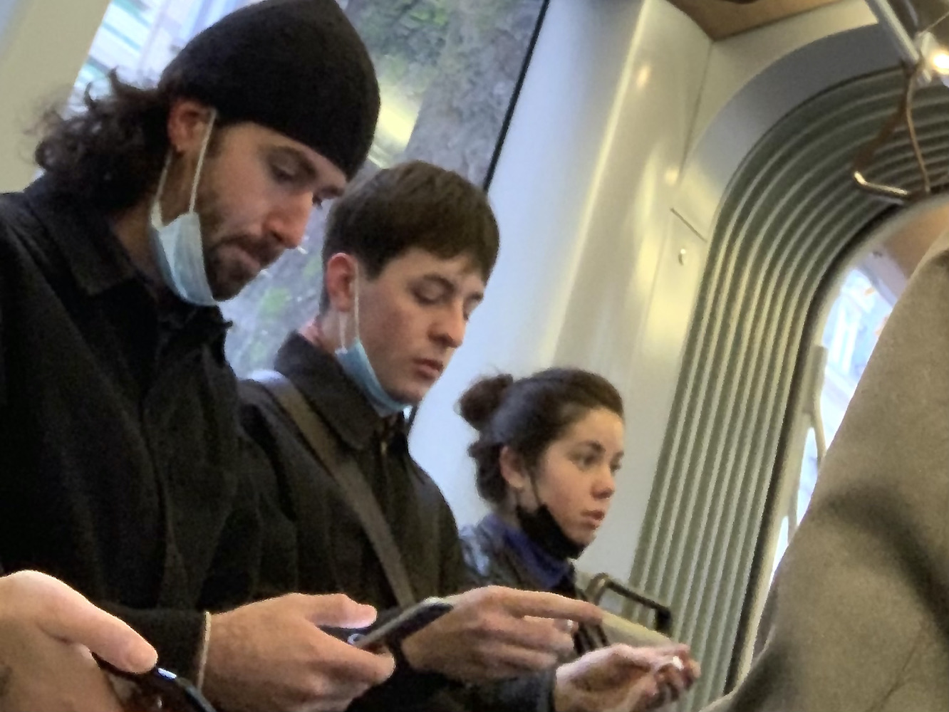 センターへ行くにはやっぱりトラムに乗らないといけないんですが、やっぱり未だに公共交通機関を使うのには強い抵抗があるワタクシ。トラムに乗車するのもとにかく周りのものには手を触れないように気を付けるのがお約束。12時に近いんでそれほど混雑してない車内で人と接触が少なさそうな個別の席に落ち着いて次の駅。ガヤガヤと人が乗ってきたんですけども、この話し声に嫌な予感がして振り返ってみたらアナタ