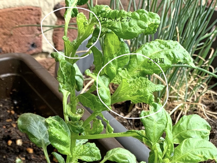 大きいプランターをほぼ独り占めしてさぞかし居心地が良いのであろう、他の芽がチョロチョロと生えてきてるのを尻目になにやらもりもりと葉を増やしております。最初その葉が何となくバジルっぽかったんで、まあバジルだったら使えるから抜かずに取っておこうかと思ってたんですが、そのバジル似だった葉がなんとなく歪んできちゃったりして、なんだこれはバジルでもない得体のしれない草なのか?とますます怪しげになってきたところ、先日じっくりと新芽を見てみたら