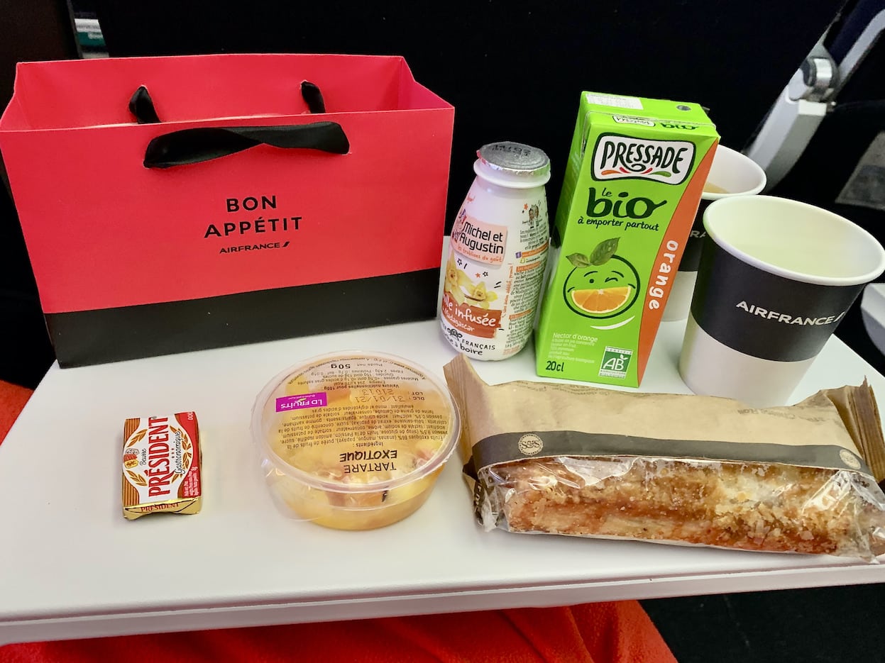 最初何か分かんなかったんでこれは?と聞けばぐっと飲むと効くわよ〜と言うので「ああ、それならeau de vieみたいなやつね?」と聞くと、そうそうそれ!って。ワタクシのノリが良かったのか「じゃお家でも飲めるように2本あげるわ!」とエキストラもくれちゃったり(笑)。まあ、機内で酔っ払うのもなんだと思ったのでこのコニャック2本はお持ち帰りで実家でちびちびいただいております。