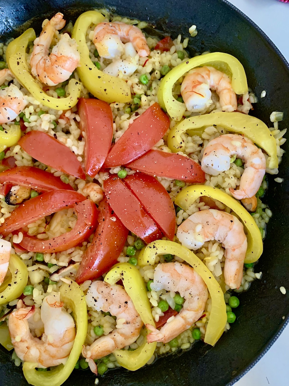 このレシピはとにかくスープに尽きる。エビの殻やお頭からお酒やワインを加えてフォン(出汁)を取るんだけど、今回は尾頭付きのエビがなかったんでちょっと薄めのスープになっちゃったものの、サフランをこれでもかと入れたんで香りが良く出来上がってて合格。パエリアが好きなのはおこげが美味しいからなんだけど、今回もイイ塩梅におこげが出来てみんなでゴリゴリこそげていただきました♪