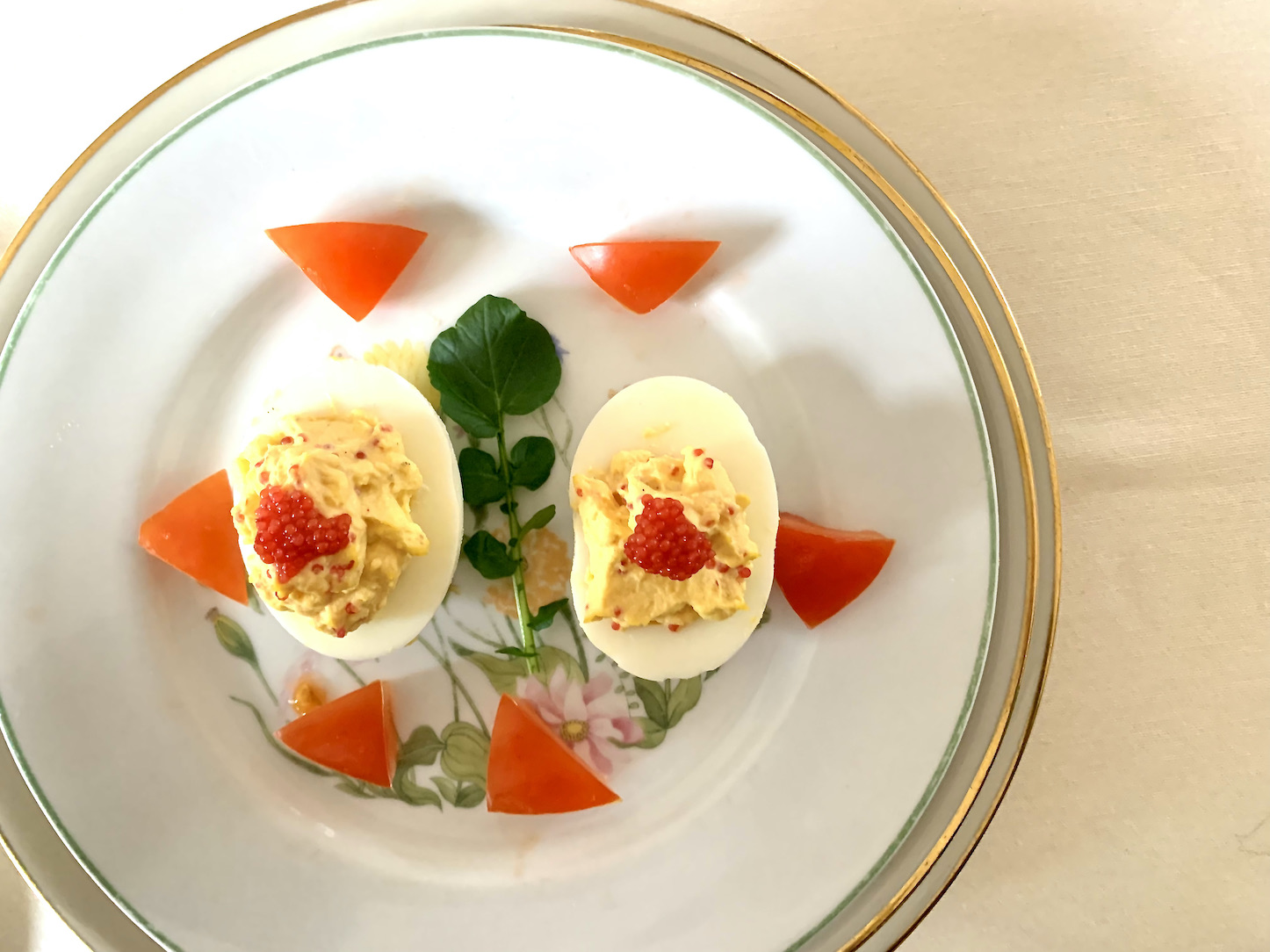 卵はPaulママが茹でておいてくれたんだけど、これがまあ殻を剥くのがお世辞にもキレイとは言い難い剥き加減でしてね・・・(白身までボリっと行っちゃってるの)。でもせっかく剥くところまでやってくれたんで文句は言えず(一応剥き方のコツは伝授しておきましたが)黄身を取り出して生クリームととびっ子をあわせてクリームにしたのをスタッフド。粗をごまかして可愛く盛り付けられたんでちょっとウレシイ。