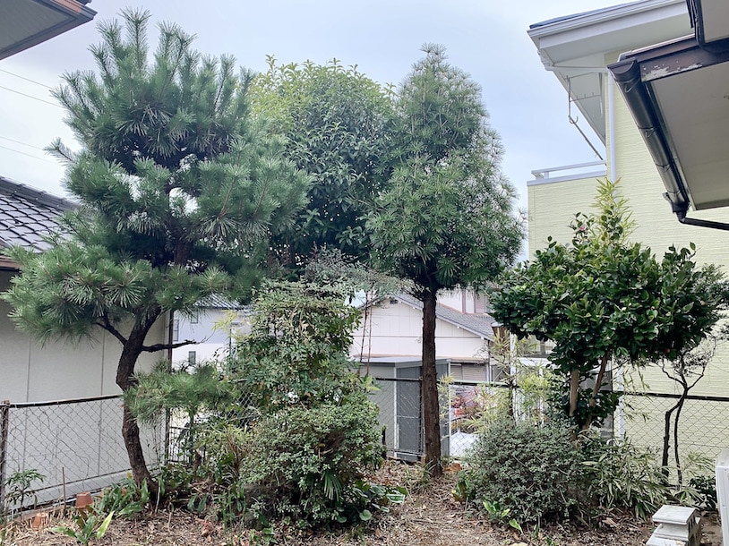 これは左から金木犀、ちょっと良く分かんない木、椿、左手前にあるのは松。