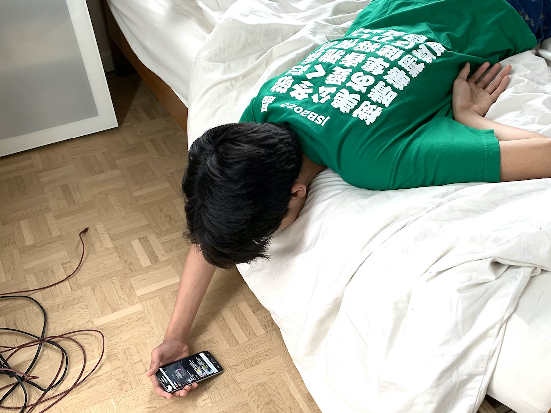 PaulのスマホでYouTube(ってかキミどういう格好で観てるの)。