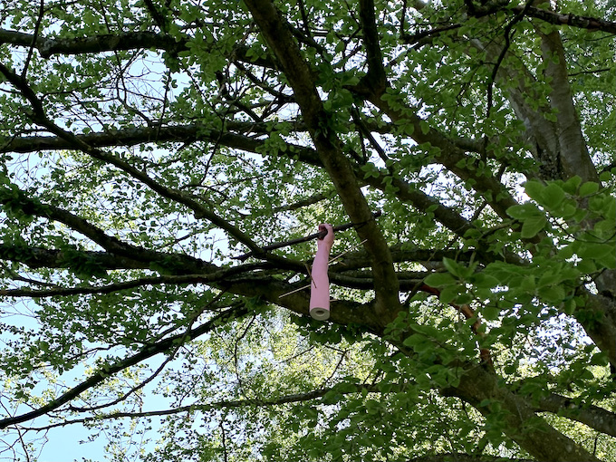 ピンクの手も顔もセラミックで出来た鳥の巣箱なんですって。