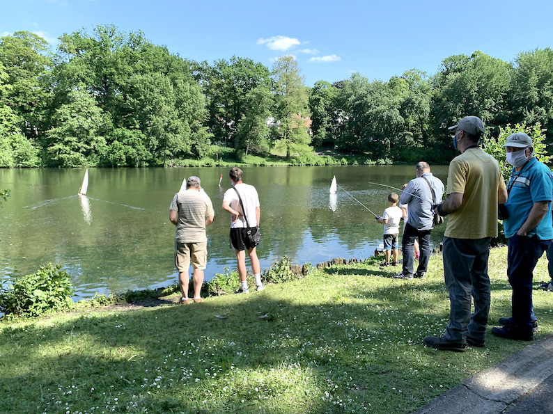 途中にある池ではリモコンのヨットを楽しむ一団が