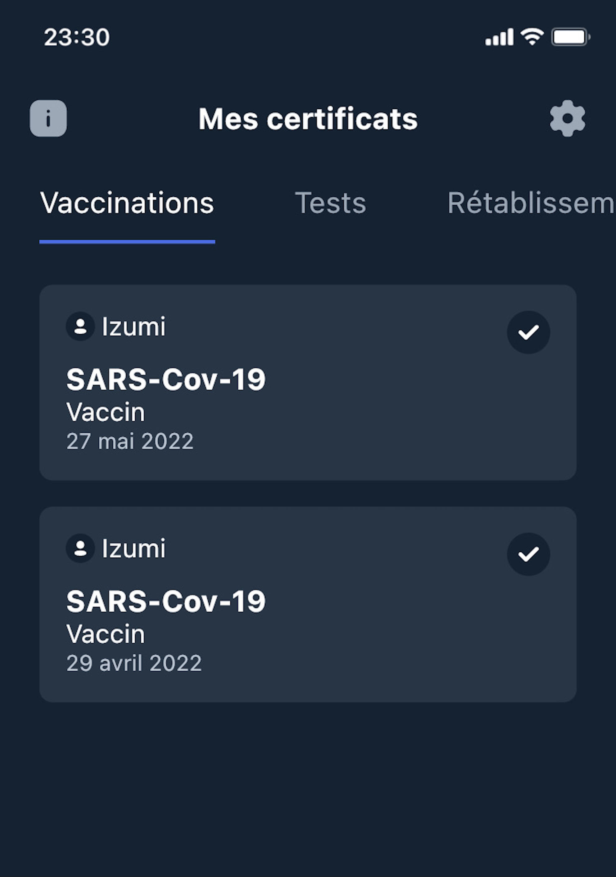 ちょっと気になったことが一つ。アプリのトップページに証明書の一覧としてまずワクチン接種が出るんですけども、その隣のタブにテストの結果と回復結果みたいなのがあるのだ。ワタクシ日本に帰った際に行く前に1回、日本で1回、そして帰ってきて1回のトータル3回テスト受けております。で、テスト受けた証明として政府の書類に記入してQRコードをいちいち受けてるんですけども、当然証明書が出てると思うじゃありませんの