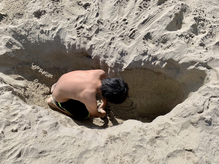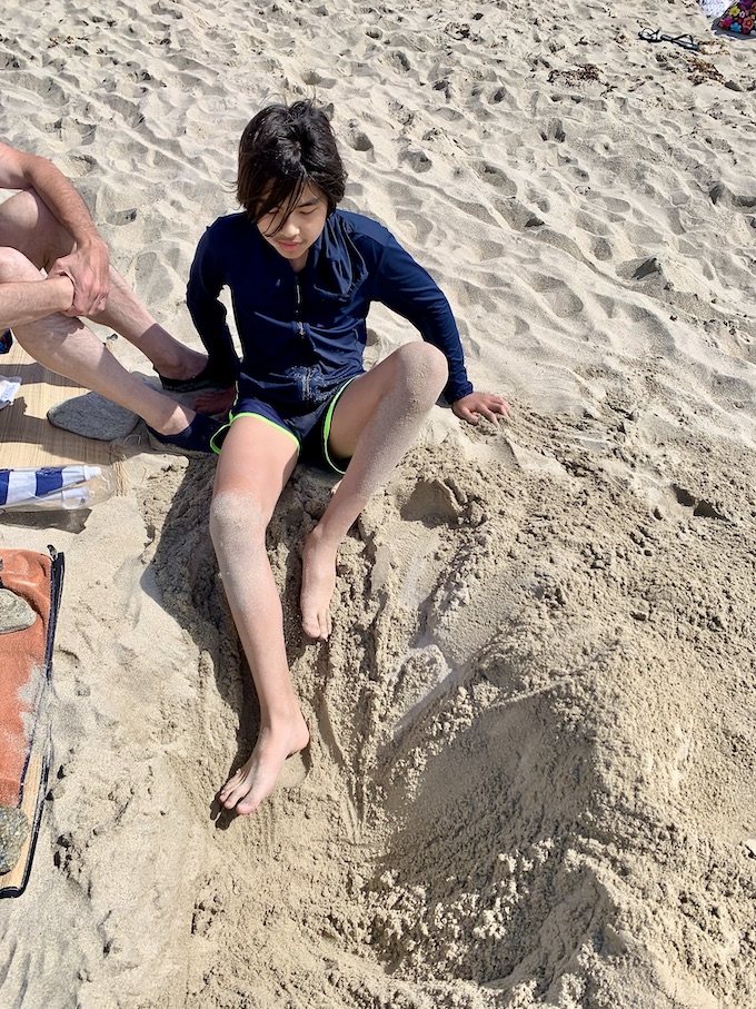 ワタクシたちの落ち着いたすぐ近くの岩のところに先に陣取ってた家族がいたんですが、そこの男の子がバケツを使ってかなり深い穴を掘削中。Seanはガン見しておりまして、ついに我慢できなくなったかするする〜っと近寄って行ったかと思ったらあっという間にこの通り