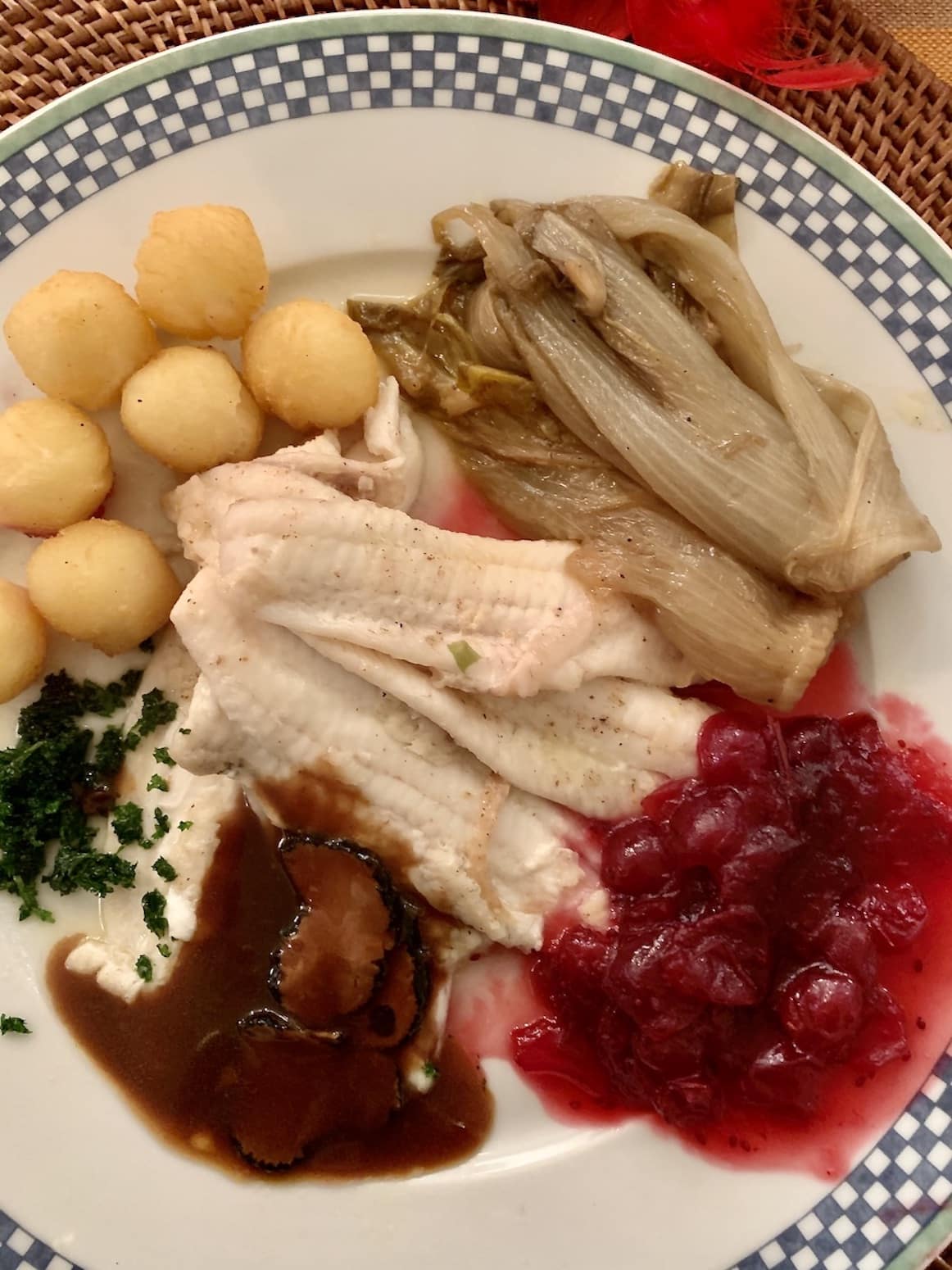 舌平目のソテーにミータリアンさんたちと同じ付け合せでアンディーブのバター煮、コケモモ系のベリーの煮たの、ポテトのクロケット、そしてトリュフのソース(盛り付けはワタクシじゃありませんのよ)。