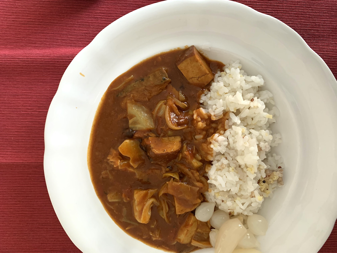 一応今回はBioの燻製の豆腐とキャベツを入れてみました。右下にピカッと光り輝いてるのは日本から持って返ってきたらっきょう。いや〜らっきょうおいしいね。カレーにはらっきょうを合わせるのがワタクシのカレー。福神漬けもあればなお良いんだけどらっきょうがあればとりあえずはOKのワタクシざんす。
